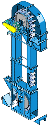 ? ? 料斗把物料從下面的儲藏中舀起,隨著輸送帶或鏈提升到頂部,繞過頂輪后向下翻轉, 斗式提升機將物料傾入接受槽內。帶傳動的斗式提升機的傳動帶一般采用橡膠帶,裝在下或上面的傳動滾筒和上下面的改向滾筒上。鏈傳動的斗式提升機一般裝有兩條平行的傳動鏈,上或下面有一對傳動鏈輪,下或上面是一對改向鏈輪。斗式提升機一般都裝有機殼,以防止斗式提升機中粉塵飛揚。
